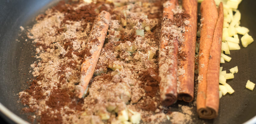 Für den Chai Sirup die Gewürze in einem Mörser zerkleinern und in einer Pfanne kurz anrösten.